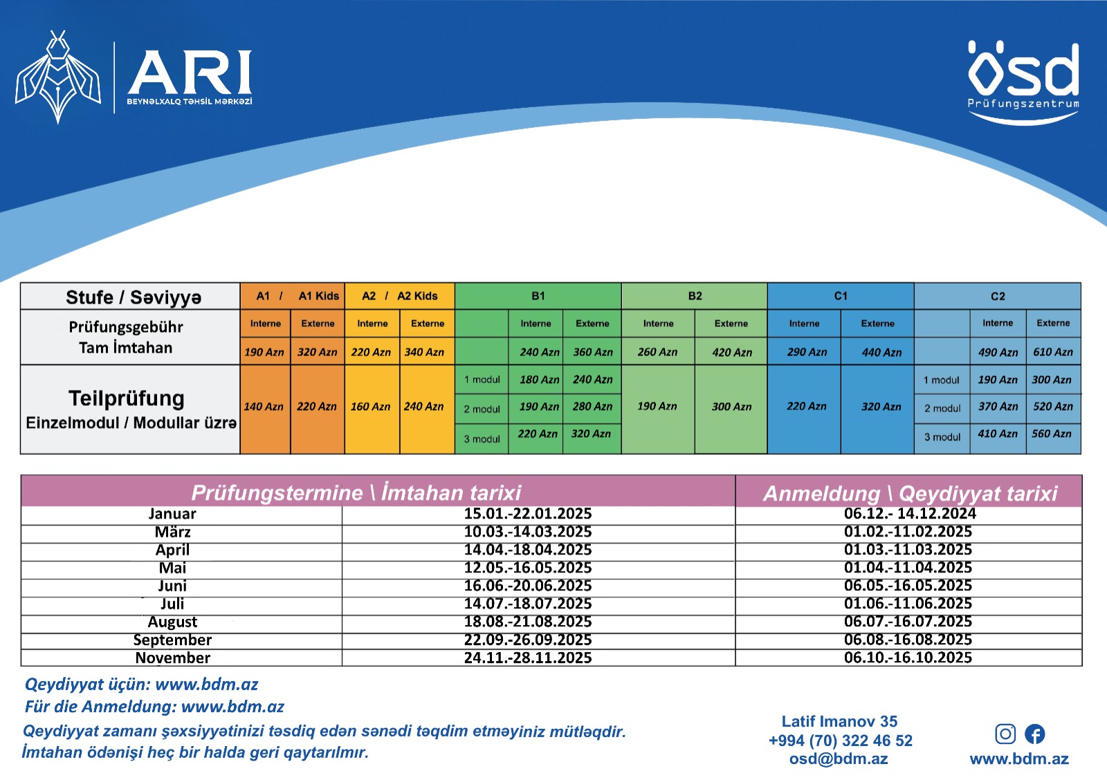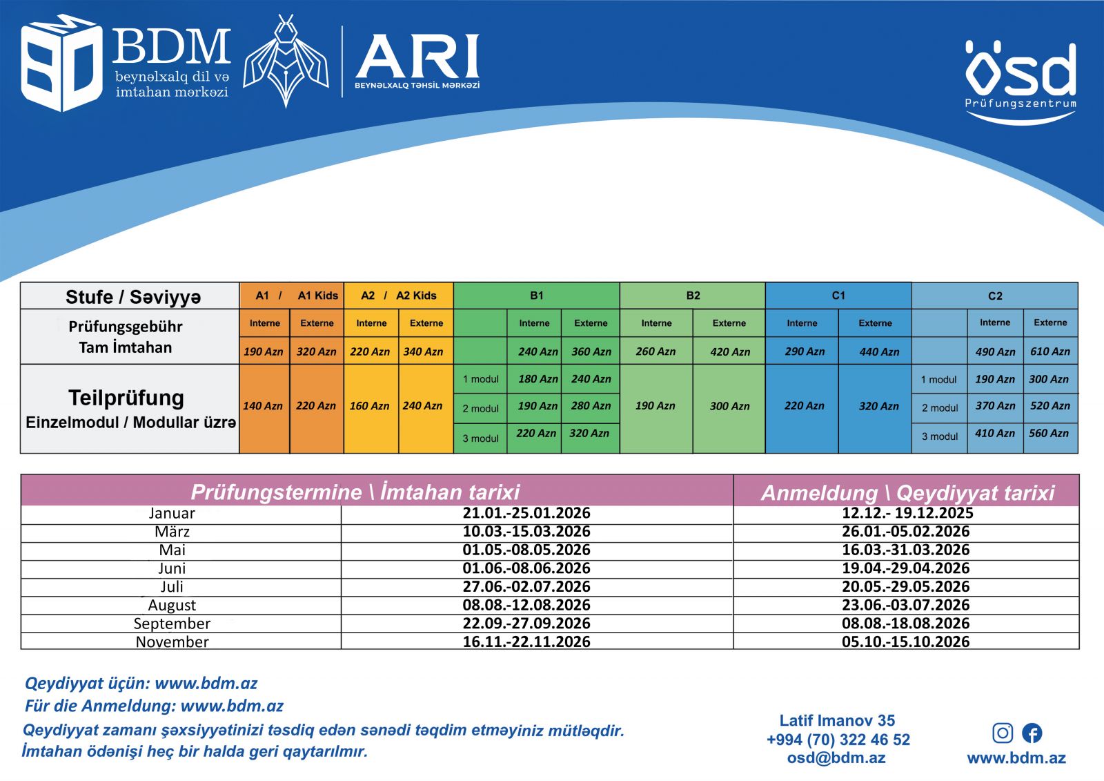 Beynəlxalq Dil Mərkəzi Azərbaycanda 2020-ci ildən etibarən rəsmi ÖSD imtahan mərkəzidir. ÖSD dil sertifikatı Avstriya, Almaniya həmçinin İsveçrə dövlətləri tərəfindən rəsmi olaraq əmək bazarında, ali təhsil ocaqlarında, digər tədris müəssisələrində keçərli olmaqla yanaşı, adı çəkilən ölkələrə yaşayış, iş icazəsi və vətəndaşlıq müraciətlərində qəbul olunan Beynəlxalq statuslu sənəddir.